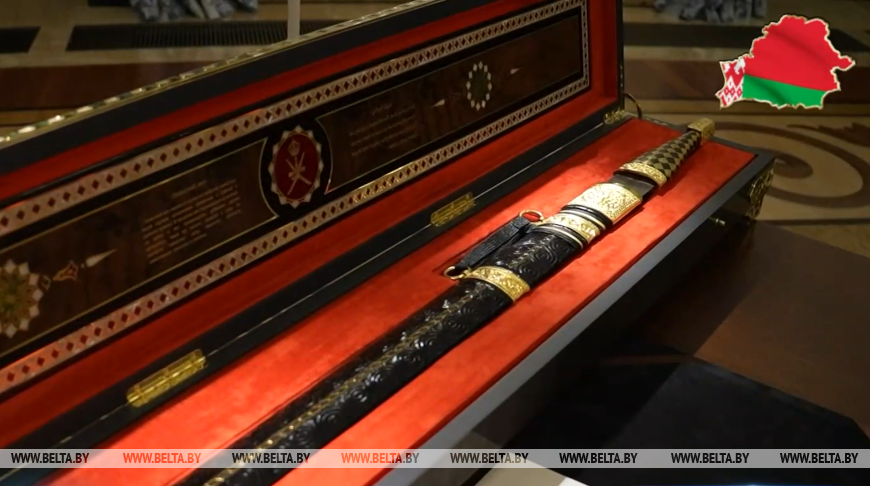 白通社明斯克10月13日电 白通社报道。阿曼苏丹海赛姆·本·塔里克·赛义德在明斯克与白俄罗斯总统亚历山大·卢卡申科举行正式会谈后,向后者赠送了阿曼传统佩剑。赠礼仪式画面已在白俄罗斯一号电视台播出。