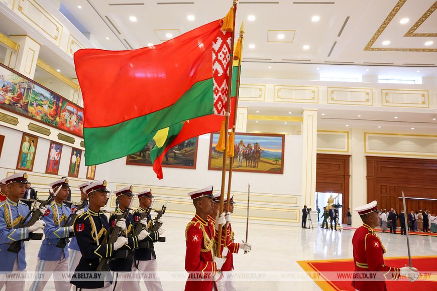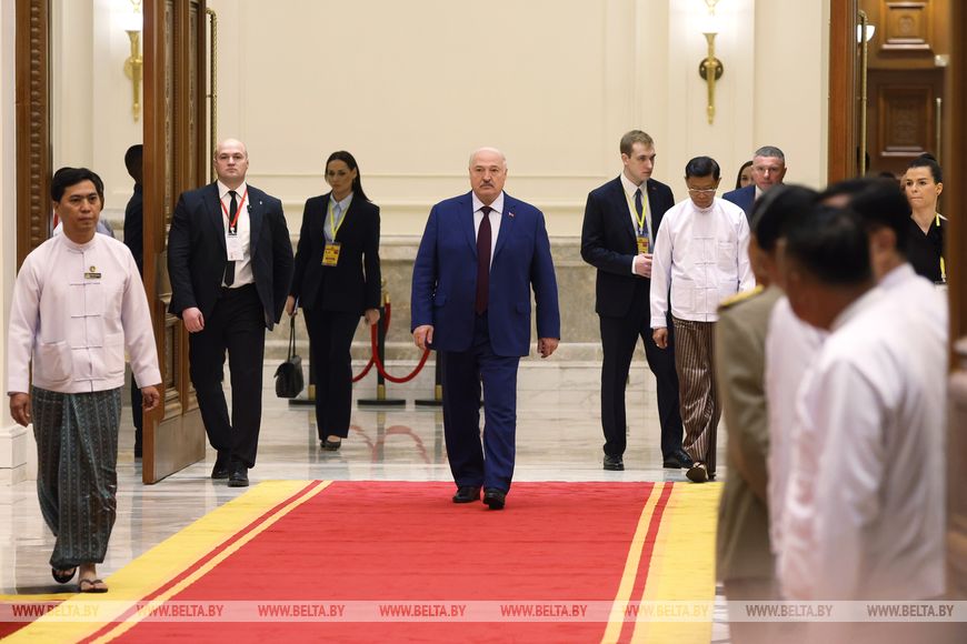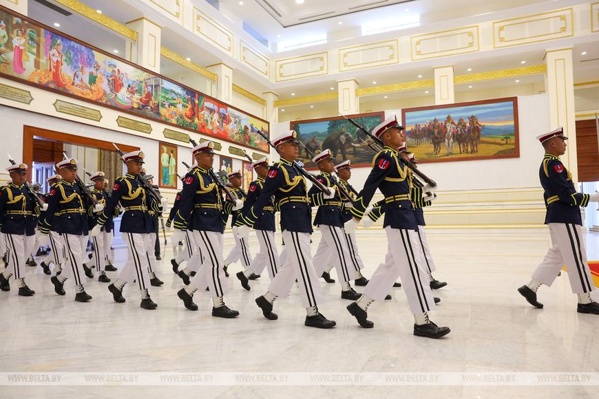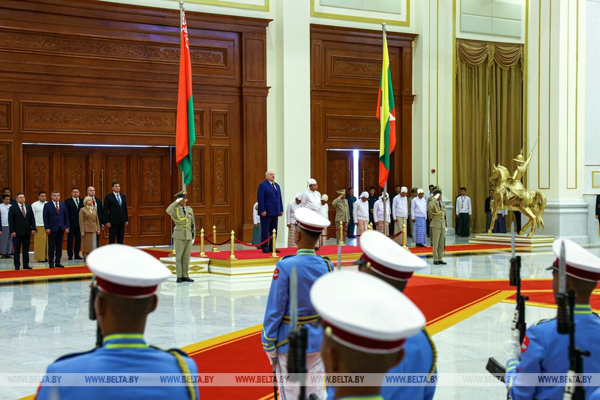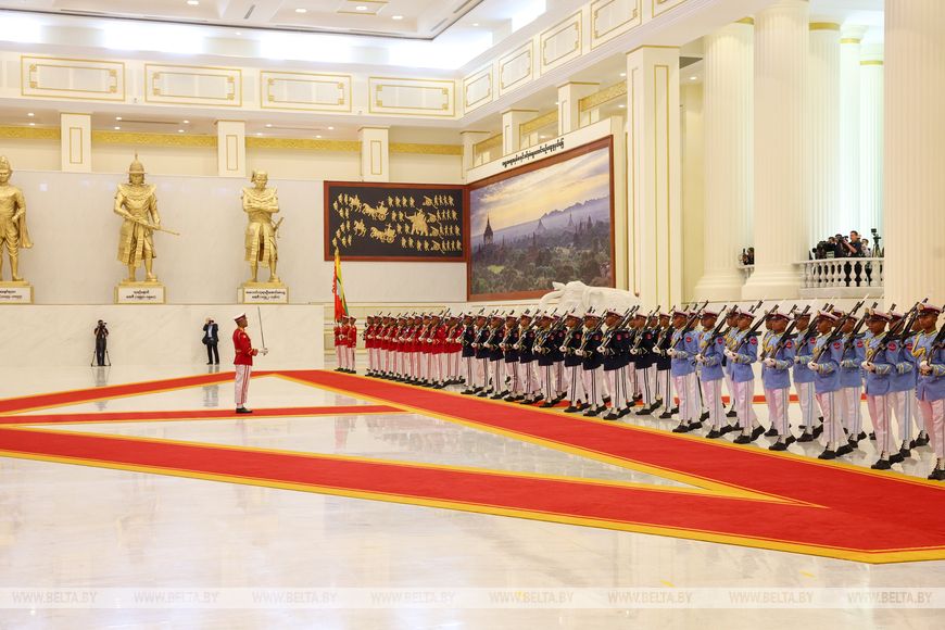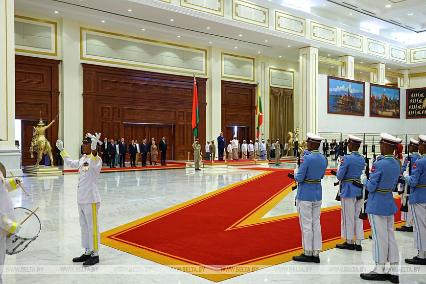 亚历山大·卢卡申科与敏昂莱之间的欢迎仪式也十分庄严。白俄罗斯国家元首受到仪仗队的迎接,乐团演奏了白俄罗斯和缅甸的国歌。