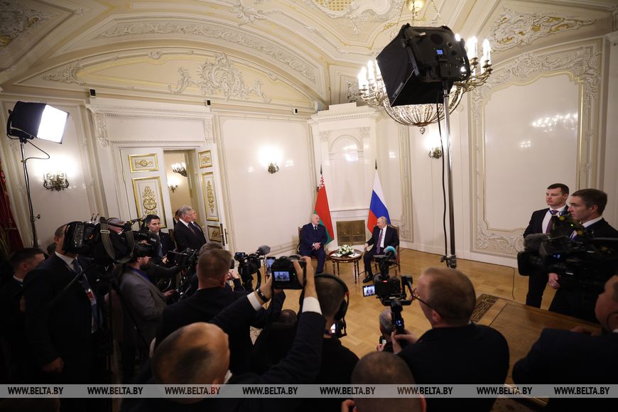 白俄罗斯国家元首表示:"感谢您的邀请。我们向来彼得堡已成为传统。说实话,我为这次出行、这次公务差旅做了准备……我想着:您刚完成了'直播连线',我则召开了全白俄罗斯人民大会(第七届全白俄罗斯人民大会第二次会议),或许我们已经完成了主要活动,终于可以稍作休整了。但事实并非如此——生活不让我们有丝毫松懈。或许这样也好,让我们保持状态。"