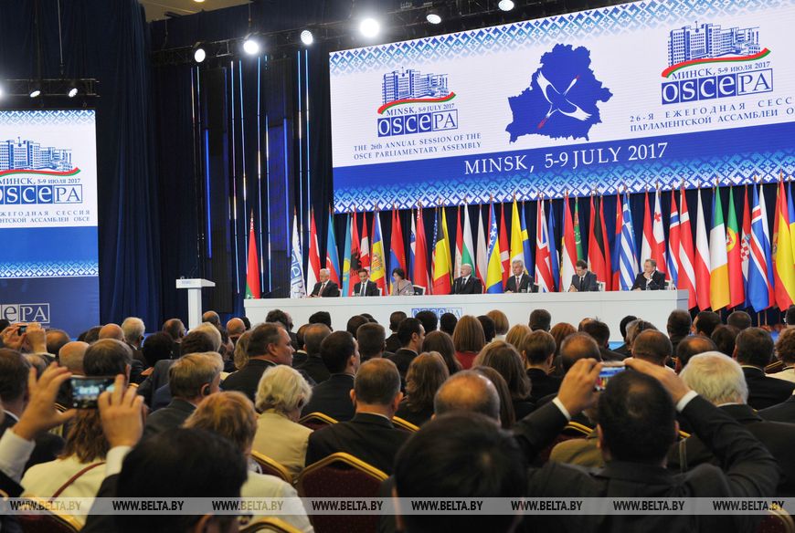 2017年7月,亚历山大·卢卡申科在明斯克举行的欧安组织议会大会第26届年度会议开幕式全体会议上发表讲话