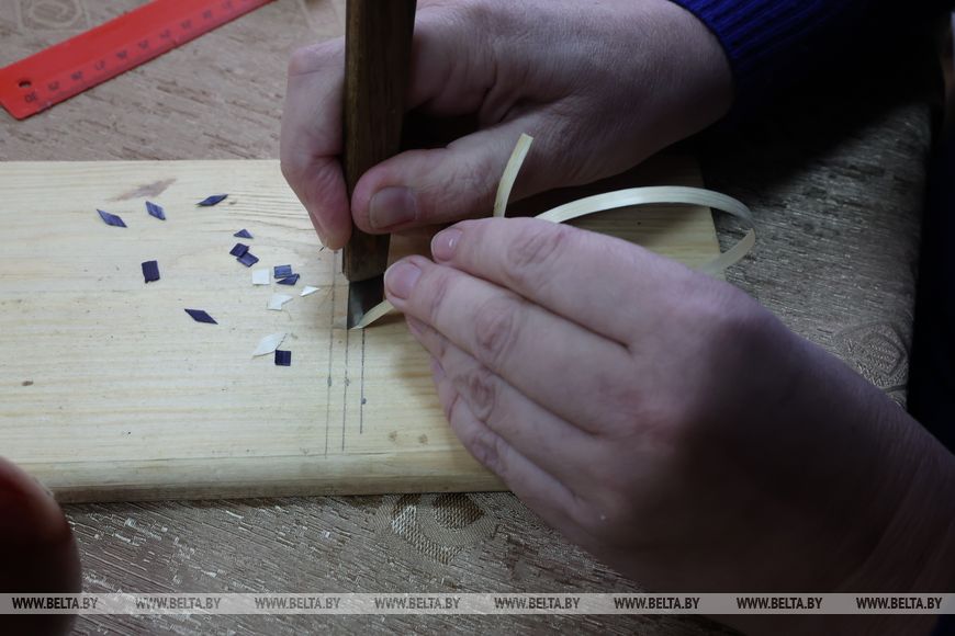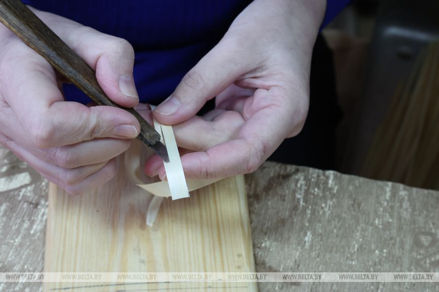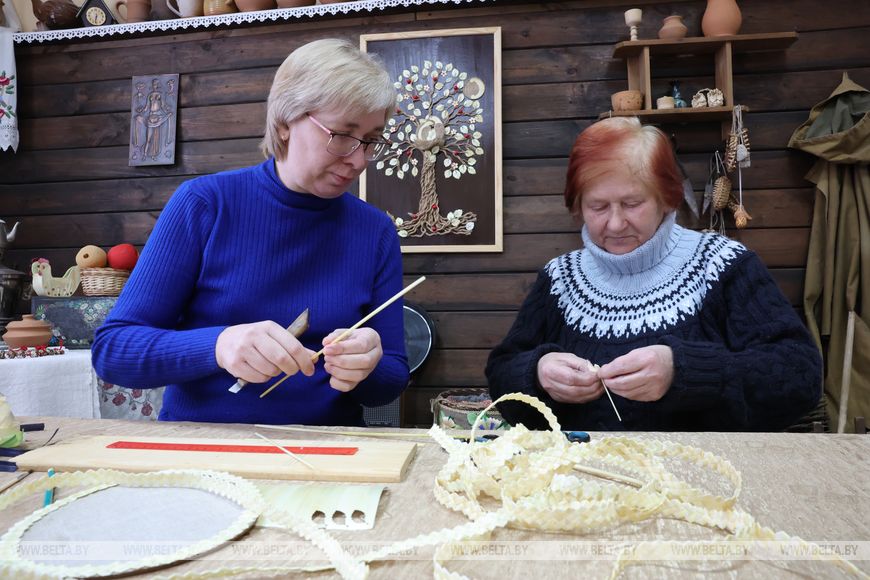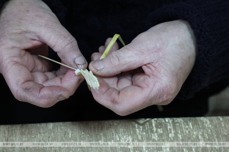首批在此工作的匠人中包括民间艺术工艺师娜塔莉娅·洛帕季娜。她的麦秸编织之路始于学生时代。“一切要从1990年代上学时说起。当时有很多兴趣小组,我们都乐意参加。”娜塔莉娅回忆道。那时麦秸直接从田间采集,用烙铁蒸制后制作出第一批作品。后来对技艺的追求引领她前往博布鲁伊斯克第15高等职业装饰应用艺术学校,三年的“木器彩绘画师、麦秸镶嵌师”专业学习决定了她的未来。