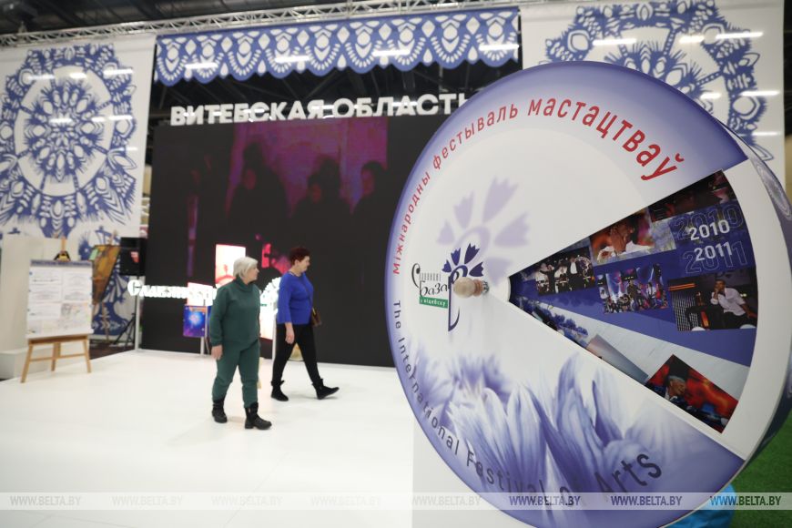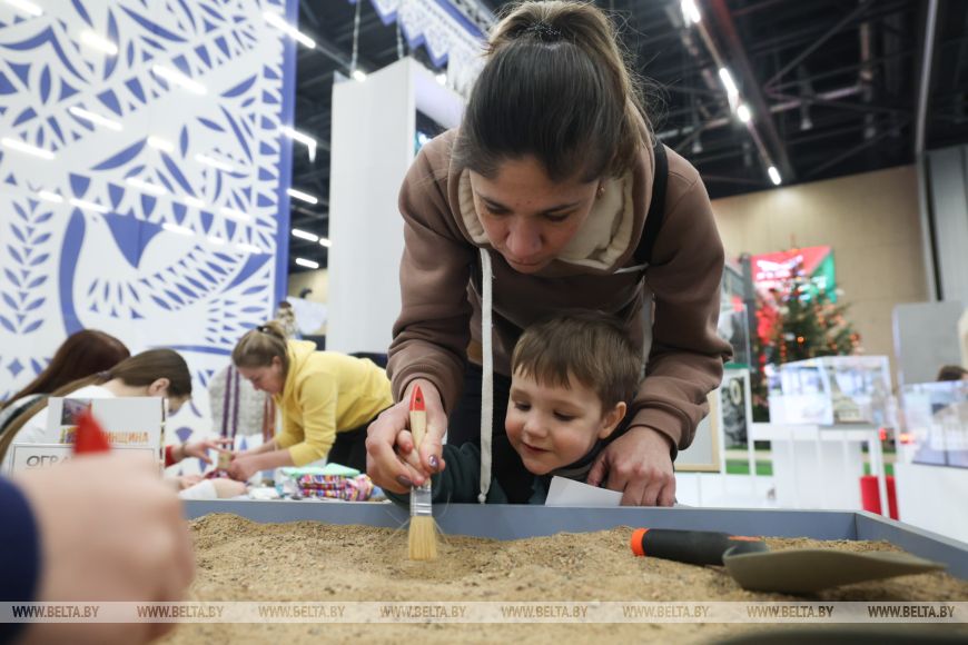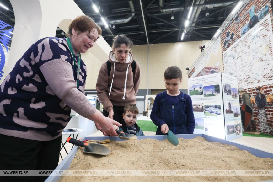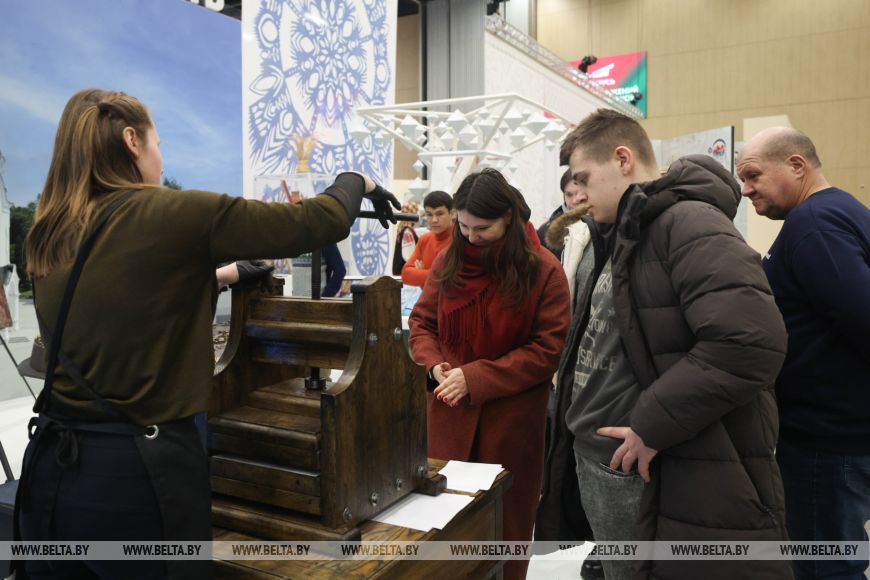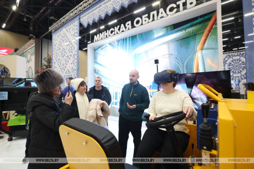 另一大厅则全方位呈现了白俄罗斯各州特色。在发现最古老舟形棋子的格罗德诺州展台,陈列着巨型国际象棋;维捷布斯克州(波洛茨克)邀请参观者体验早期印刷匠人的工作;布列斯特州展区以机器人技术为亮点——服务机器人分发奶酪,还可与仿人机器人交流;观众还能坐进别拉斯矿用自卸车驾驶室,一览作为工业旅游中心的米卡舍维奇花岗岩采石场。戈梅利州展示了编织艺术(涅格柳布编织传统近期被列入联合国教科文组织非物质文化遗产名录)、尤罗维奇古人类遗址、鲁缅采夫-帕斯克维奇宫建筑群保护计划。明斯克州重点推介旅游区及明斯克城市象征,并提供纪念币压铸体验;莫吉廖夫州则聚焦新建博物馆与卫国战争纪念内容,包括布伊尼奇战场纪念馆的展示。
